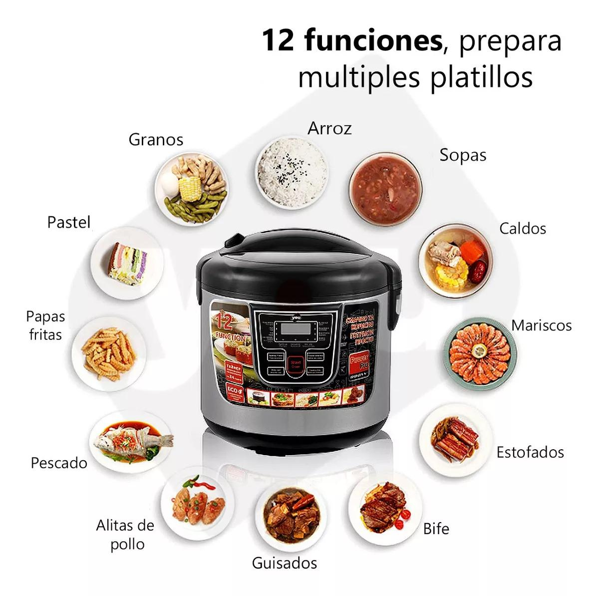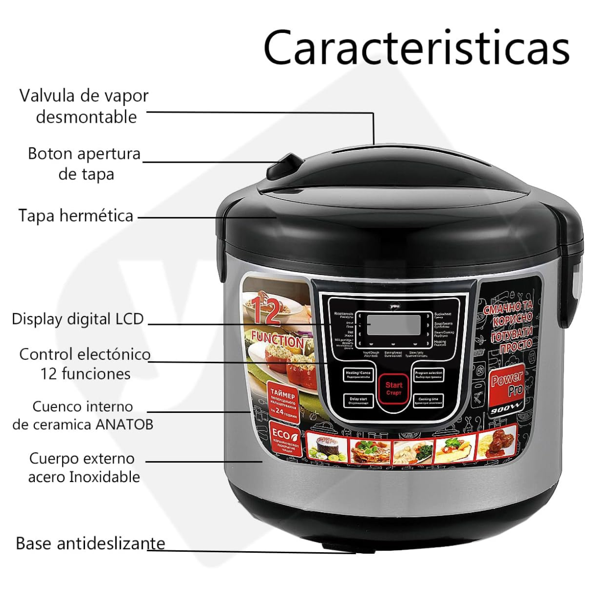 Esta olla eléctrica incluye placas cerámicas antiadherentes, pantalla digital con programas automáticos y funciones inteligentes para cocinar, calentar y mantener caliente con solo un toque.