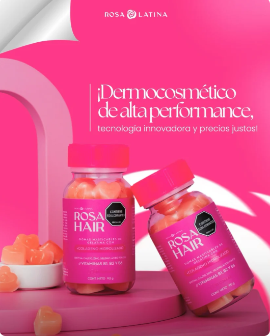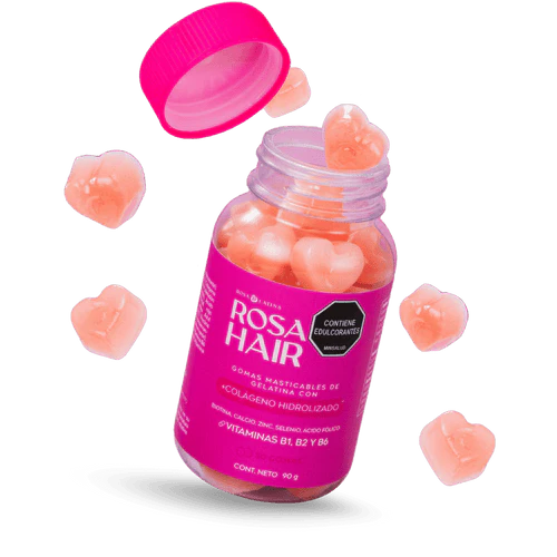 Rosa Hair está formulado con ingredientes poderosos, como colágeno hidrolizado, biotina y vitaminas para fortalecer tu cabello, uñas y piel. Una solución natural para mujeres que buscan un cabello más fuerte, voluminoso y sin caída.